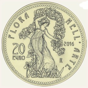 The 20 Euro Gold coin is inspired by the frescoes of Italian painter Ettore de Maria Bergler(1850 – 1938). Specifically featuring scenes from his remarkable Floralia fresco.