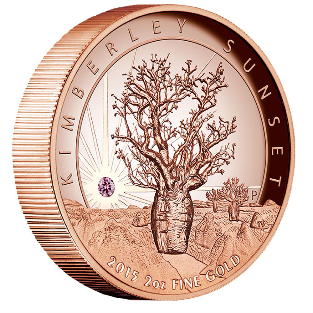The special high relief proof 2oz gold coin features a baobab tree in the harsh Kimberley landscape. The coin is an exact mirror image of the 2015 Kinberley Sunset pink gold coin. The coin has a small white diamond set in the reverse field just above the horizon. This is meant to represent the brilliant light that each new dawn brings.